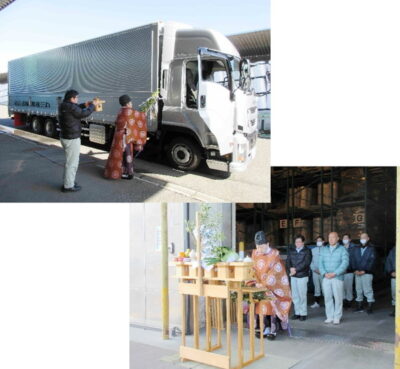 2025年2月、大型トラックを更新。 大型トラックは西条工場を起点とし、1日に2往復、大洲工場、五十崎工場、高知県の香南工場へ原料・製品などを運搬しています。 無事故・無違反で就業する事が社会貢献の一つであると認識しており、その思いを込めて、伊曽乃神社の宮司による安全祈願を実施しました。 また、フォークリフトも11台保有。工場内から完成した製品を倉庫へ搬送したり、出荷の為、トラックへの積込み等、工場内外を1日中、走り回っています。 日々の朝礼による安全運転の声掛けやフォークリフト安全運転講習会なども実施し、全従業員が安全に業務に取り組めるよう全面的に支援しています。 |