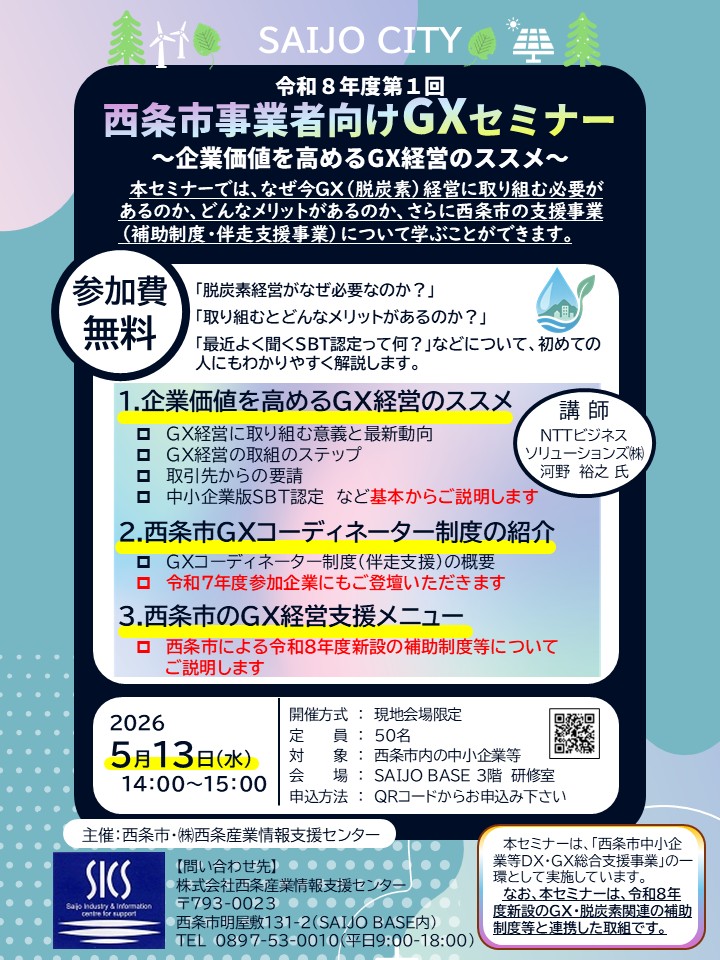 西条市では、中小企業の皆さまを対象に、GX(グリーントランスフォーメーション)・脱炭素経営に関する基礎セミナーを開催します。