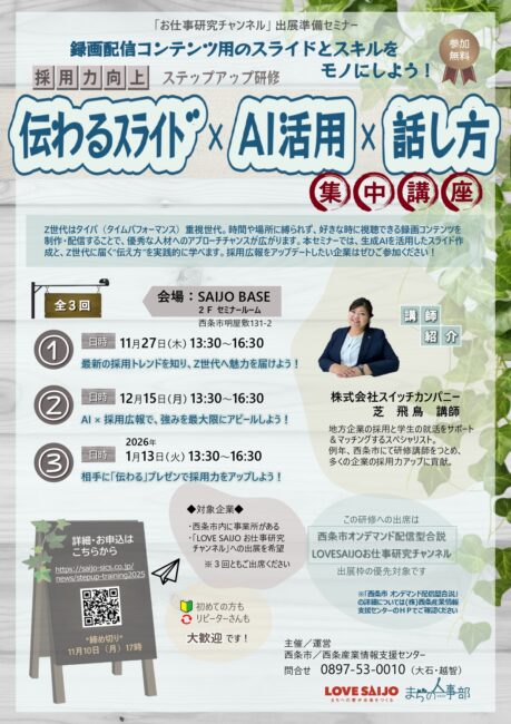本研修では、オンデマンド配信型企業説明会「LOVE SAIJO お仕事研究チャンネル」への出展を見据え、配信時代に合った“伝わるプレゼン”を作る実践型の講義をお届けします。